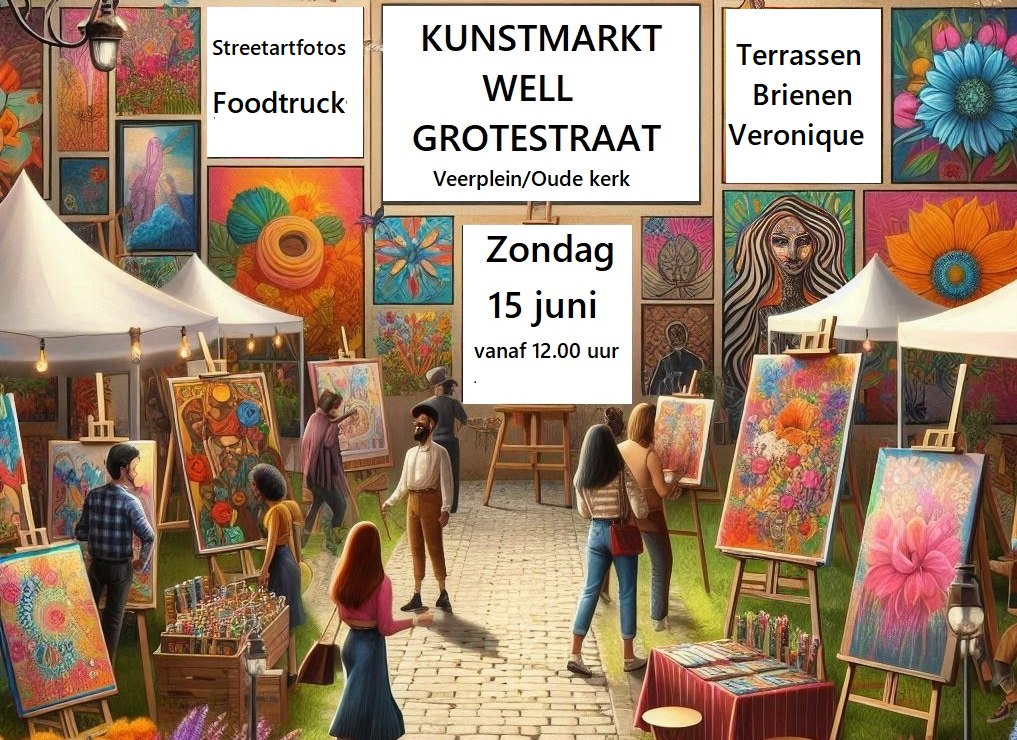 Op zondag 15 juni 2025 is het zover: een sfeervolle kunstmarkt in Well ter ere van Sint Vitusdag! Vanaf 12.00 uur ben je van harte welkom rond op de mooiste locatie van onze gemeente: de boulevard langs de Grotestraat, tussen de Oude Kerk/Sint-Vituskapel en de gezellige terrassen van Veronique en Brienen. Voor een middag vol kunst, cultuur en gezelligheid.